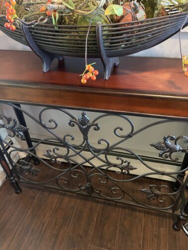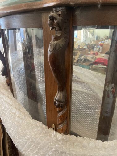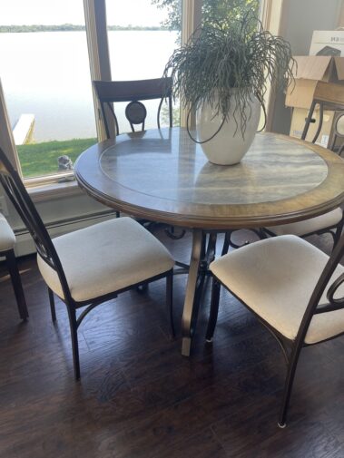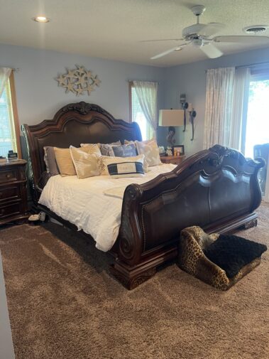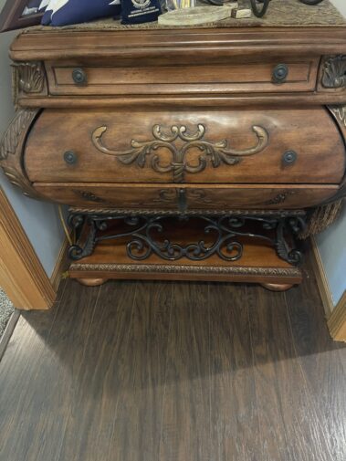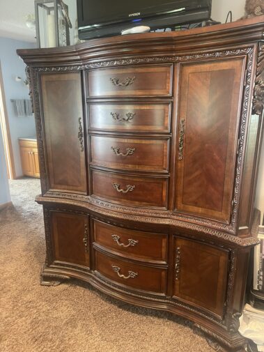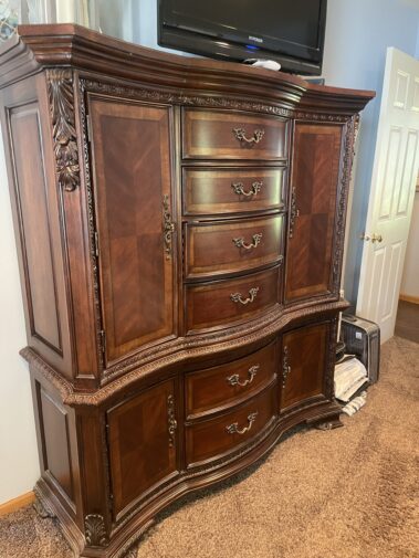 Leather Sofa Recliner and matching Recliner Rocker; Quality Upholstered Furniture including Coil Core Robin-Bruce and others; Round Marble Dining Table and 6 chairs; Carved Hall Table; Massive Carved King Sleigh Bedroom Set; Complete Double Bedroom Set; Whicker Patio Furniture; Drop front desk; Lighted Roundtop lighted China Cabinet; Curved glass China with Lion Heads; Custom Log Furniture; Deck furniture; And more…