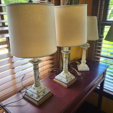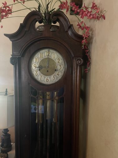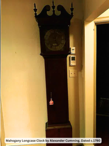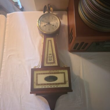 Martin Hall 18th Century English clock; (3) grandfather Clocks; Seth Thomas Banjo Clock; Sev. Pcs. Silver Plate and Sterling; German Baby; (2) Cast Iron Door stops; Charlie Weaver Bartender; Wood grip Revolver; Stamp Collection; Needlepoint print; Cast iron clown; Needlepoint picture; wood carvings; wall mount Water Fountain; Sev. Fancy Mirrors; Silver Castor Set; Needlepoint-Walnut Fireplace screen; 2 Enameled Privacy Screens; Sterling knife rests; Costume jewelry; wind chime; beaded purses; Many quality Lamps;