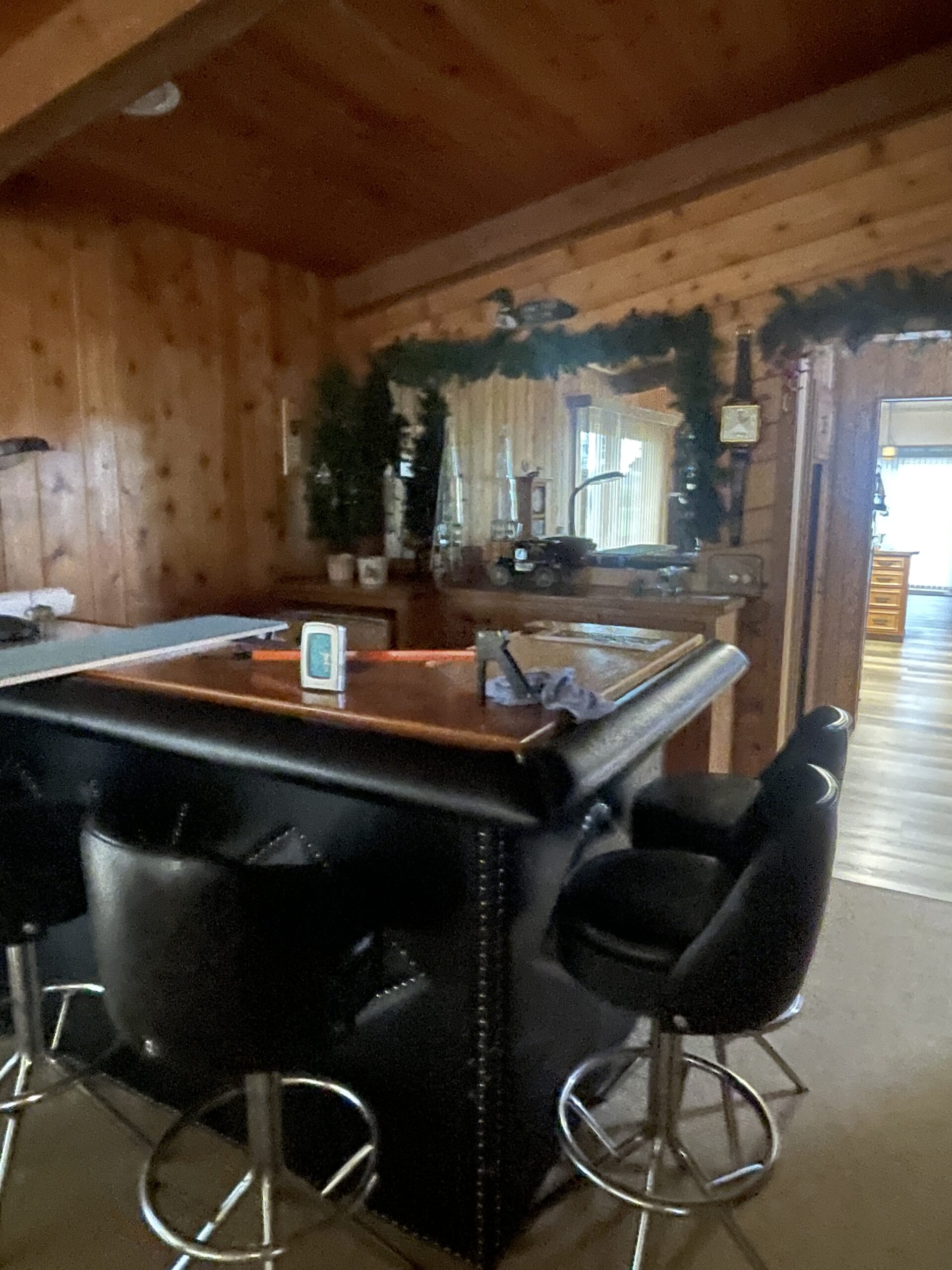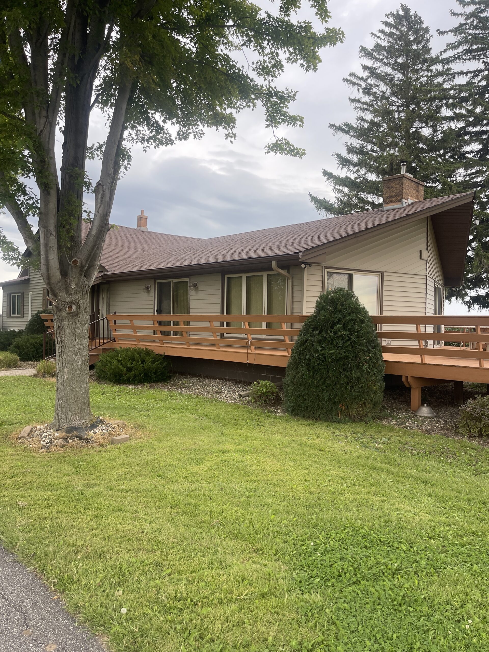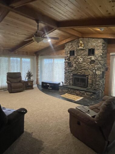 Home Features: Main Floor Family Room, Vaulted Ceilings, Fireplace, Patio Doors to Wrap Around Deck, Wet Bar.